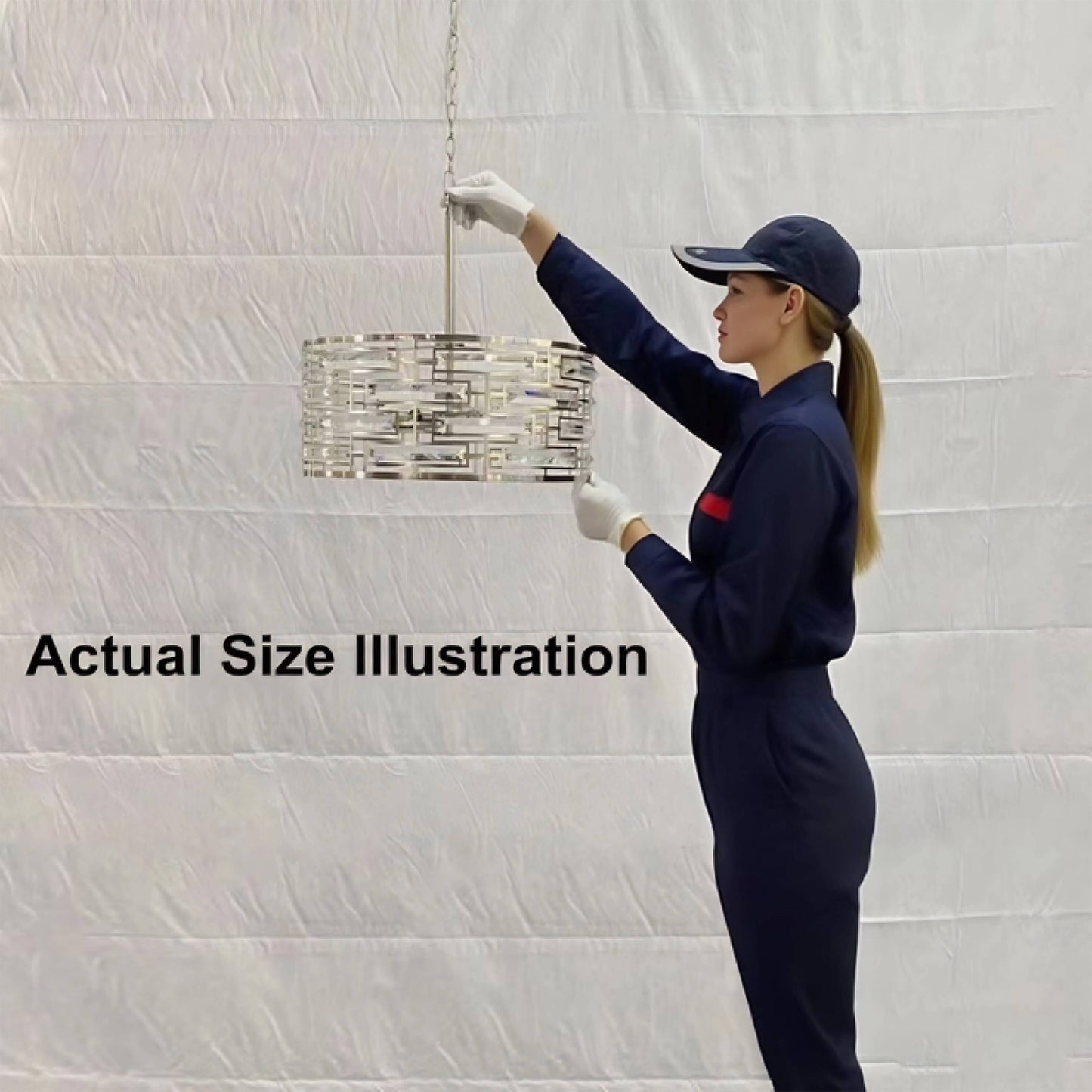 • Fixture:  20 inches in diameter x 18 inches H; Shade: 20 inches in diameter x 8.5 inches H; Ceiling plate: 5.1 inches in diameter x 1 inch H; Max hanging height (from ceiling to the bottom of the light fixture): 59.4 inches, which can be shortened.