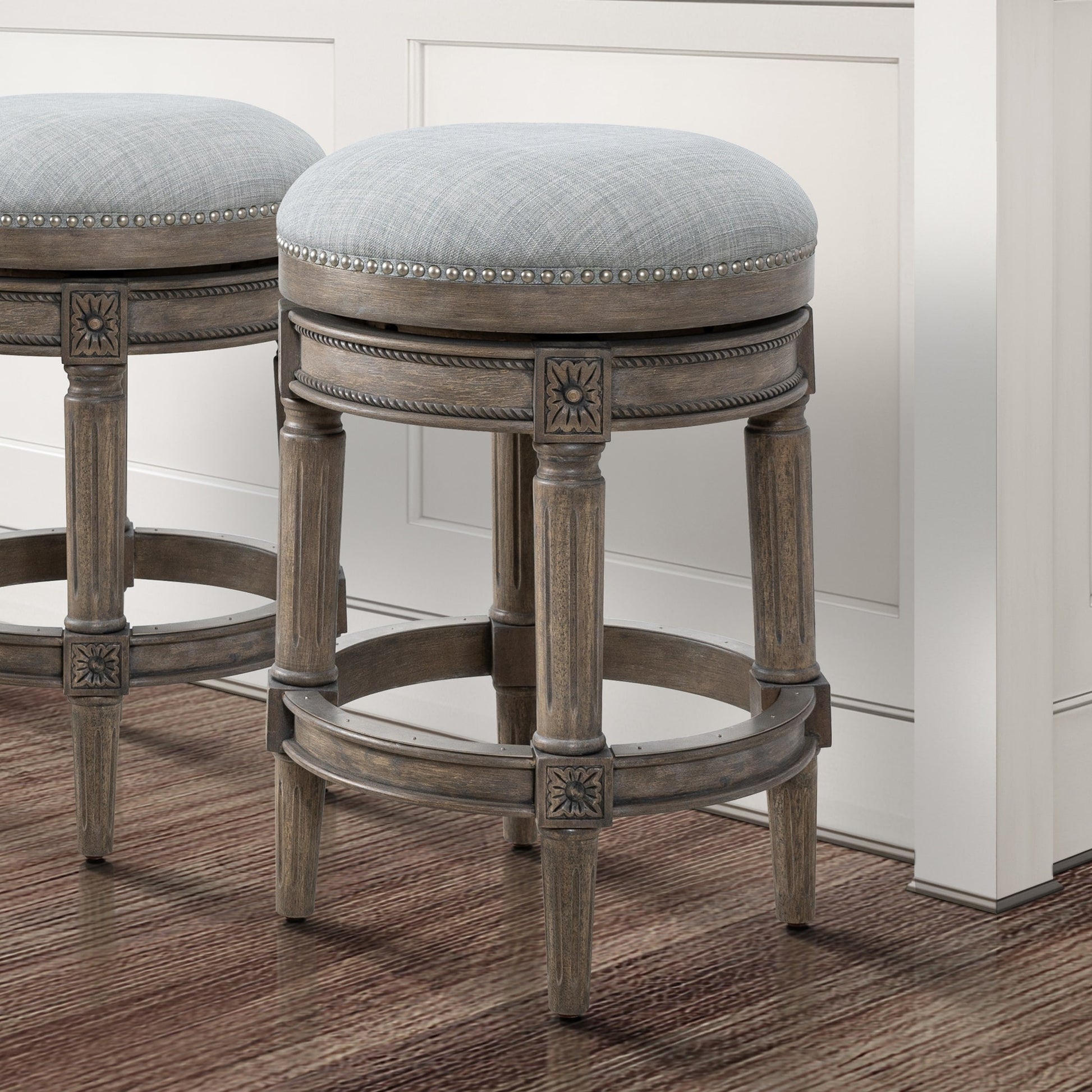 Bring a touch of comfortable sophistication to your dining area or recreation room with our backless barstool. Our 26in. counter-height stool features 360-degree swivel, metal footrests, and hand-applied nail heads to add to the design.  With no tools required for assembly, this stool is the perfect addition to any bar or table. Assembly is a breeze with no tools required. Perfect for kitchen counters, this stool stands 26 inches high.