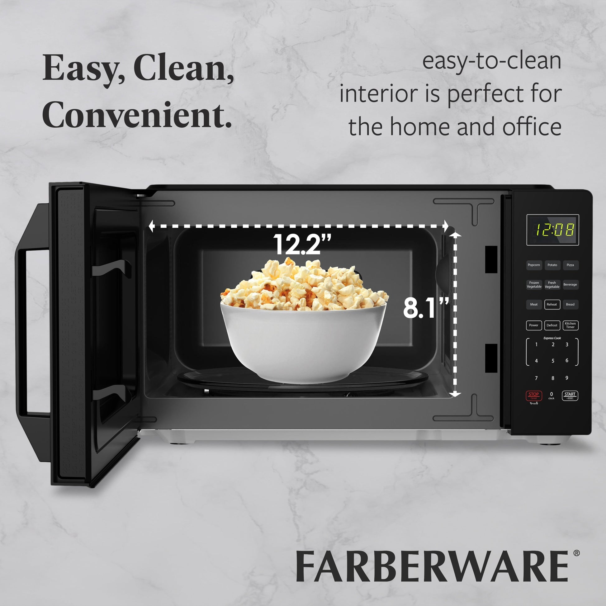 The Farberware Countertop Microwave Oven in sleek black combines modern aesthetics with powerful performance to meet your daily cooking needs. Featuring a 700-watt output and 0.7 cubic foot capacity, this microwave oven is perfect for small kitchens, dorm rooms, or offices. The digital control panel offers intuitive navigation through ten power levels, while the auto-cook functions provide quick options for popcorn, pizza, potatoes, and more. The 9.56-inch turntable ensures even cooking, and the child safety lock adds peace of mind. Its durable, easy-to-clean interior and energy-efficient operation make it an ideal addition to any modern kitchen.