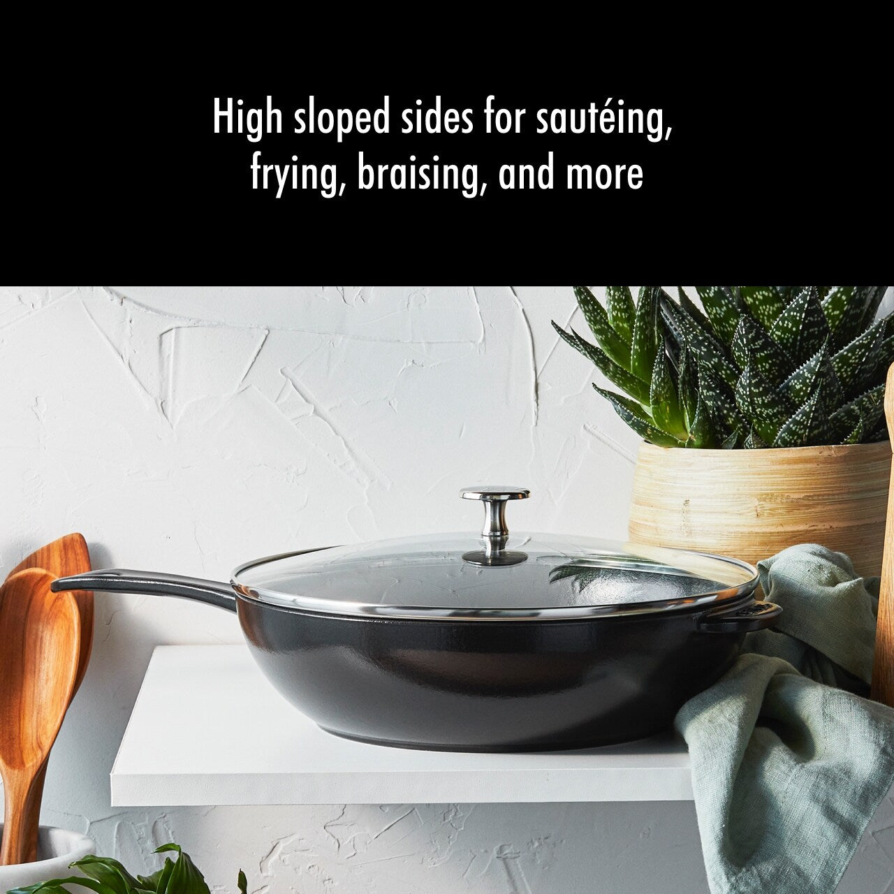 • 2.9-quart cast iron pan with high sloped sides that’s ideal for sautéing, frying, braising, and more