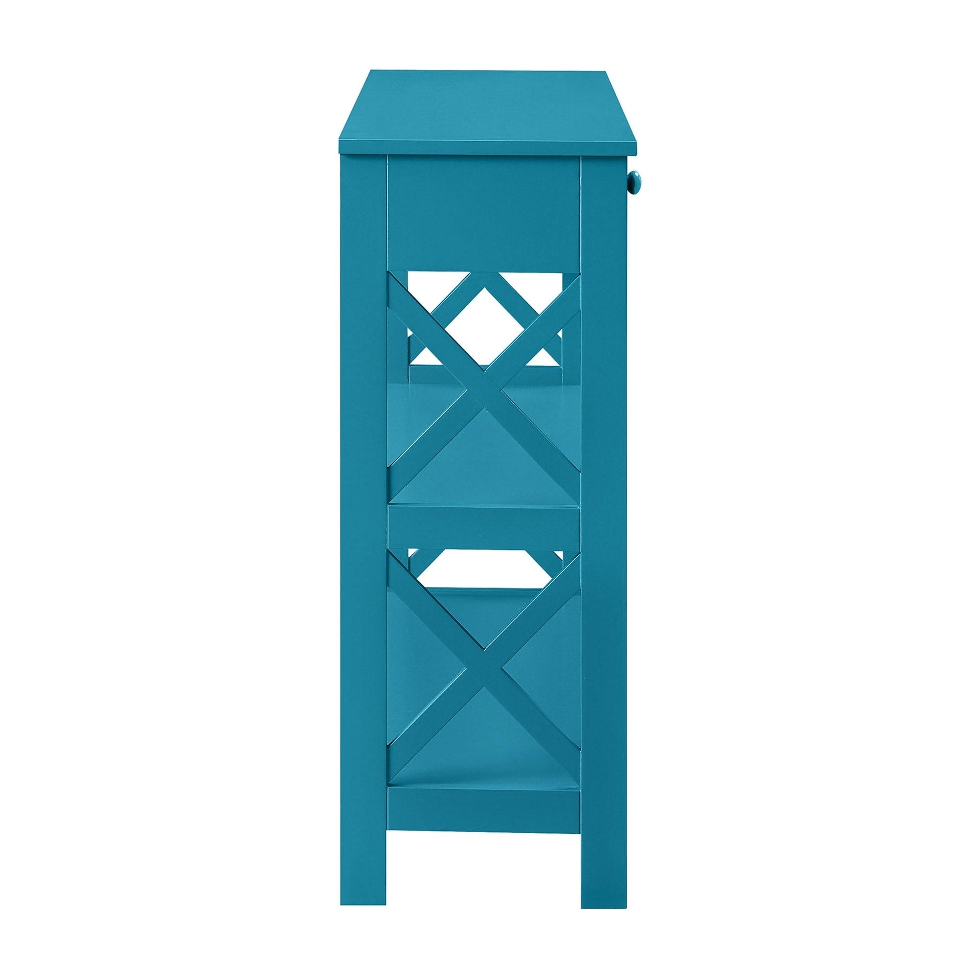 Make your home truly timeless with the Oxford 1 Drawer Console Table with Shelves by Convenience Concepts. This transitional piece features a pull-out drawer on smooth roller slides with two stylish drawer knobs for easy accessibility. The spacious drawer offers plenty of room to stow away entryway essentials and everyday necessities. The X-frame side panels and the three tiers of shelving make this console the perfect decorative piece to display in any room of your home. Beautifully crafted from MDF, non-lead-based paint, and particleboard, this unit is sure to last. Add coordinating pieces to your home from the Oxford Collection by Convenience Concepts, each sold separately.