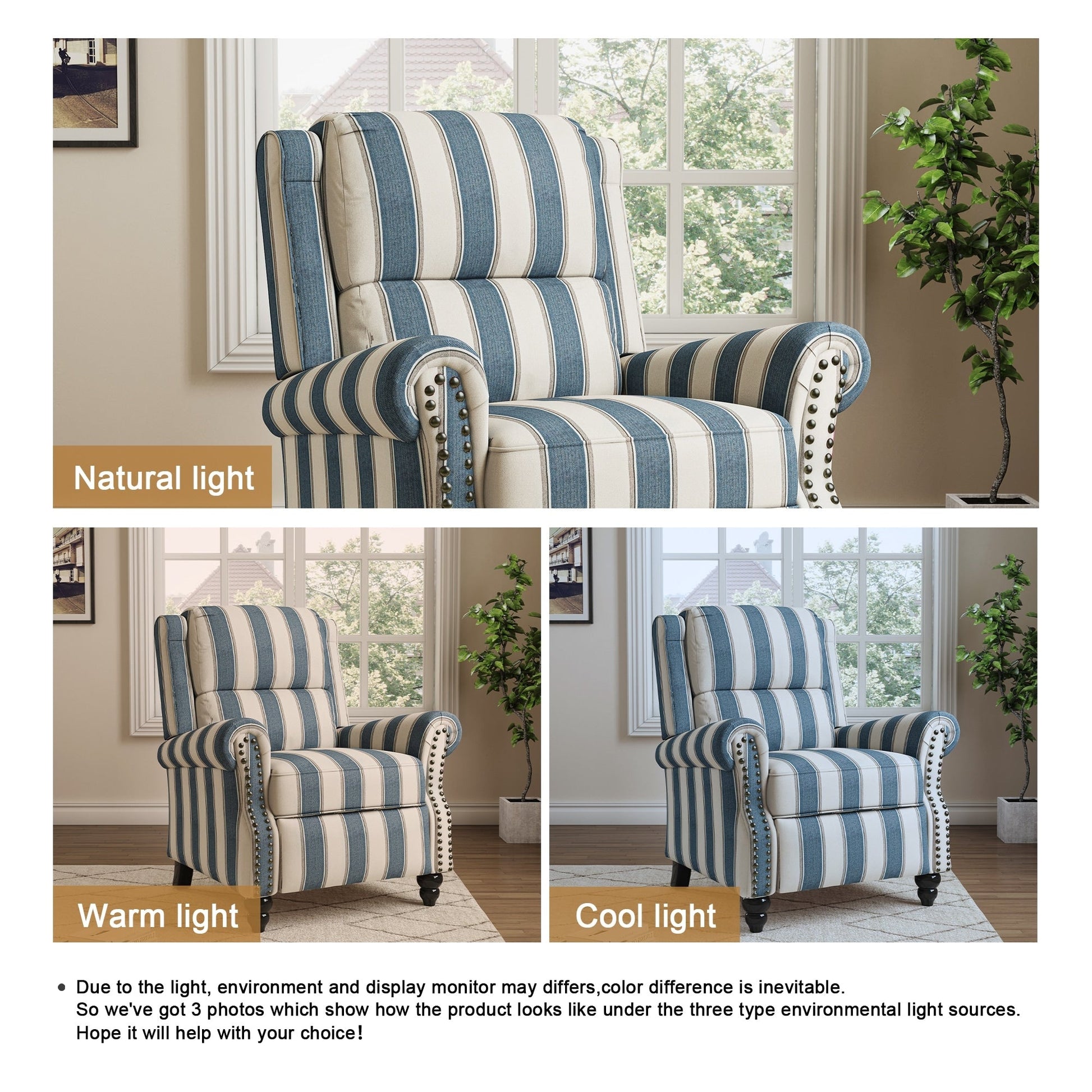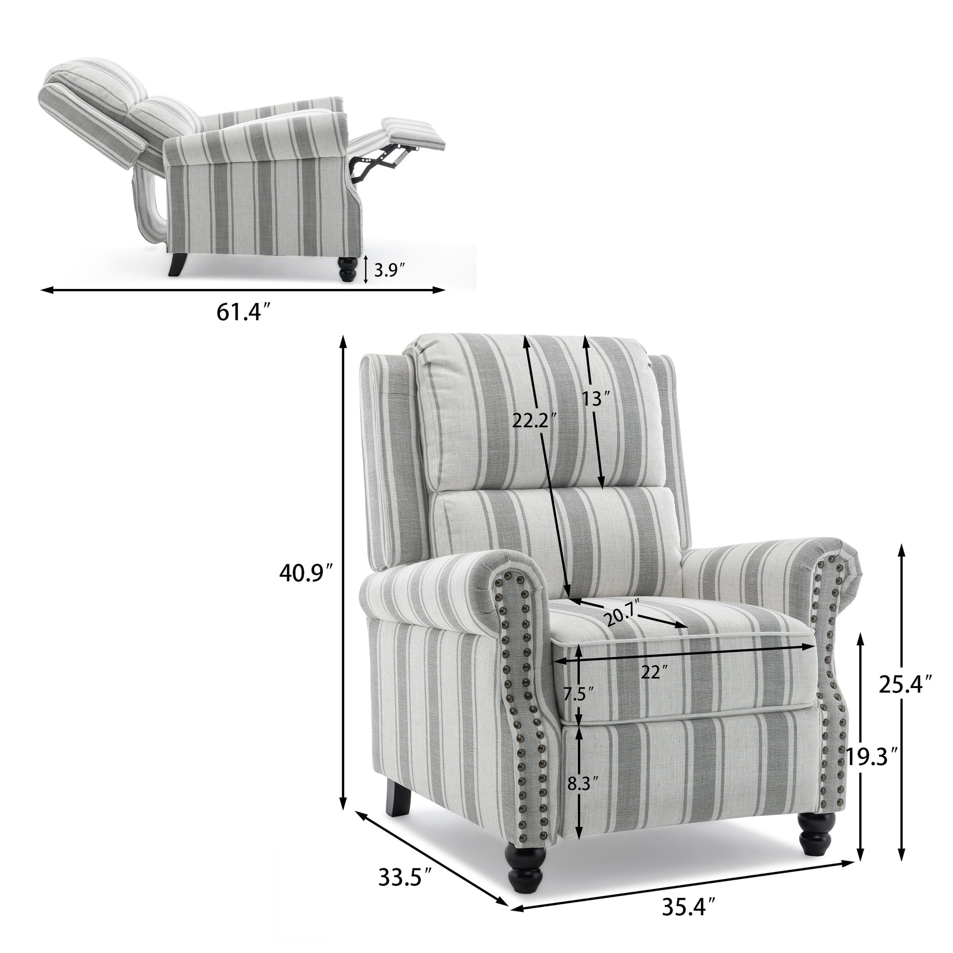 Upgrade your relaxation space with this sleek and versatile recliner chair, designed to provide both style and comfort.  The smooth reclining mechanism by body and foot perfect control, allows you to effortlessly find your perfect position for total relaxation. Padded with high-density foam in the headrest, lumbar, backrest, and armrests, it provides full-body support and relieves pressure while you unwind. Whether you're watching TV, reading, or napping, this recliner offers the ideal balance of comfort and style. Two premium options to choose from, smooth PU leather for a modern, easy-to-clean finish, or cozy linen fabric with floral or striped patterns adding a cozy, decorative touch, perfect for a more vibrant or traditional aesthetic. With nailhead trim and various color/pattern choices, it easily complements any living room, office, or study, making it both a functional seating solution and a stylish statement piece for your home.