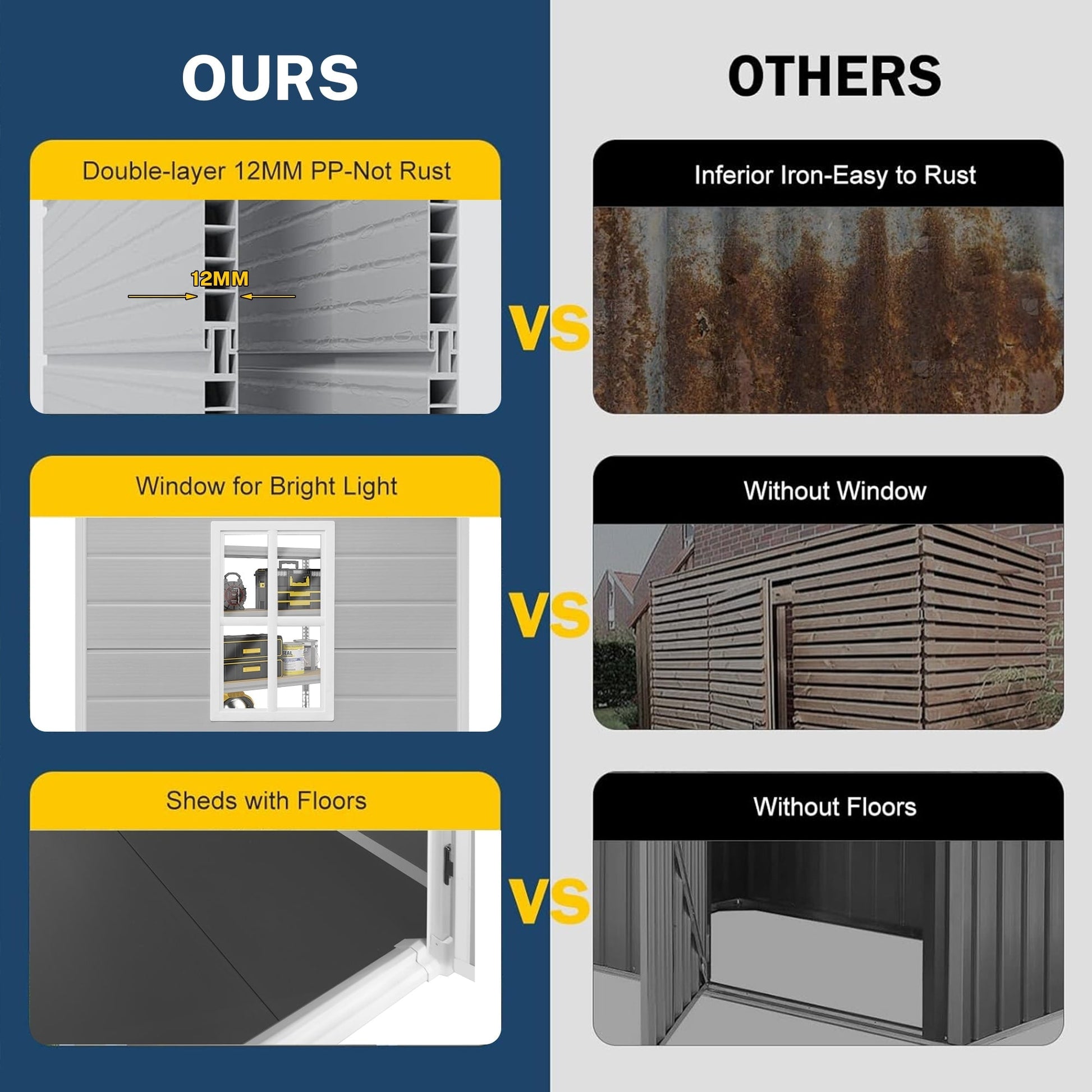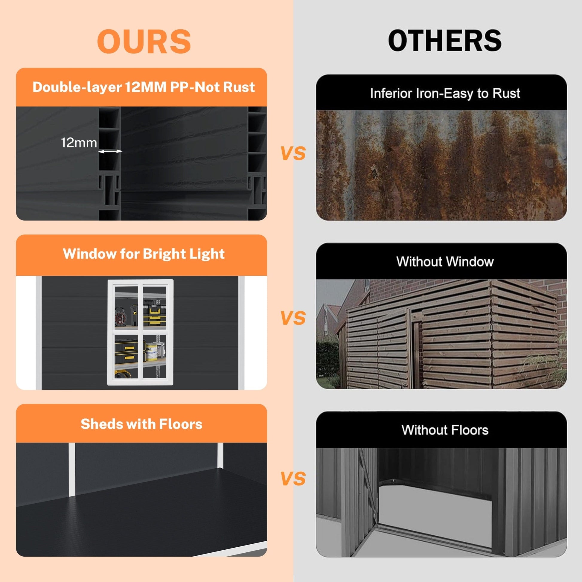 • This shed has TWO packages(Gray/Dark Gray-6 x 4, Dark Gray-6 x 8)/THREE packages(Gray-8 x 6, Dark Gray-8 x 10)/FOUR packages(Gray-8 x 10) that may not arrive at the same time. If you only receive one package, please wait patiently for several days.
